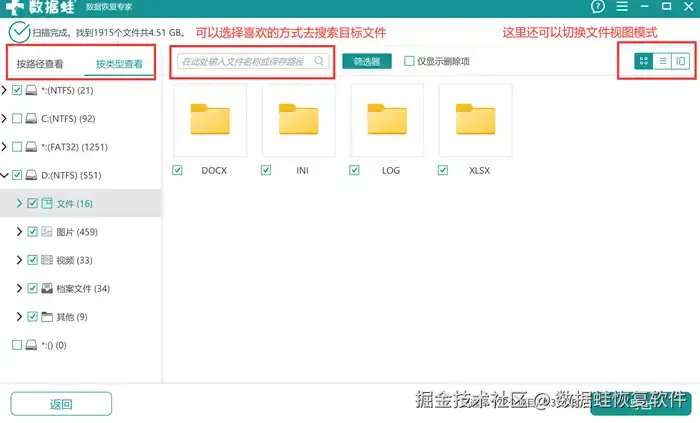 步骤3: 扫描结果出现后,扫描结果页面的左边分为【按路径查看】和【按类型查看】。如果您想要更加省时,可以通过【按类型查看】右边的搜索框直接输入文件相关信息,能够更加迅速地找到目标文件。