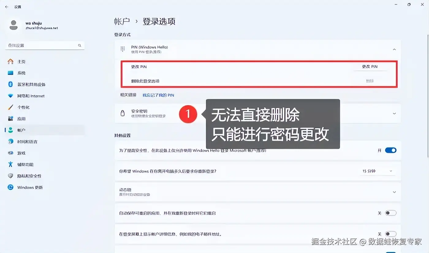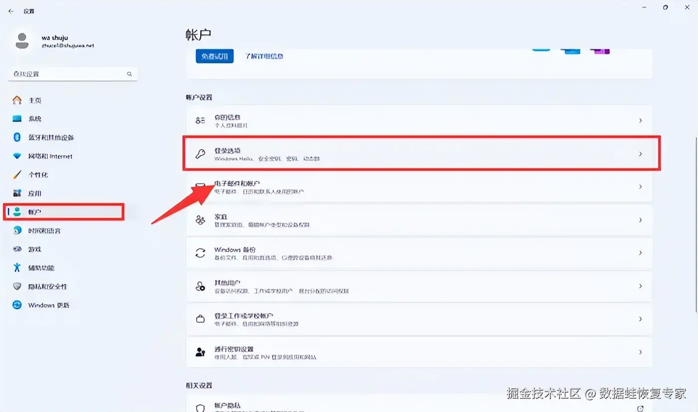 第三步:在设置页面中,选择 【账户】 。在账户页面中,你可以看到与账户相关的各种设置选项。接下来,点击左侧的 【登录选项】 。这将显示与登录相关的各种设置。