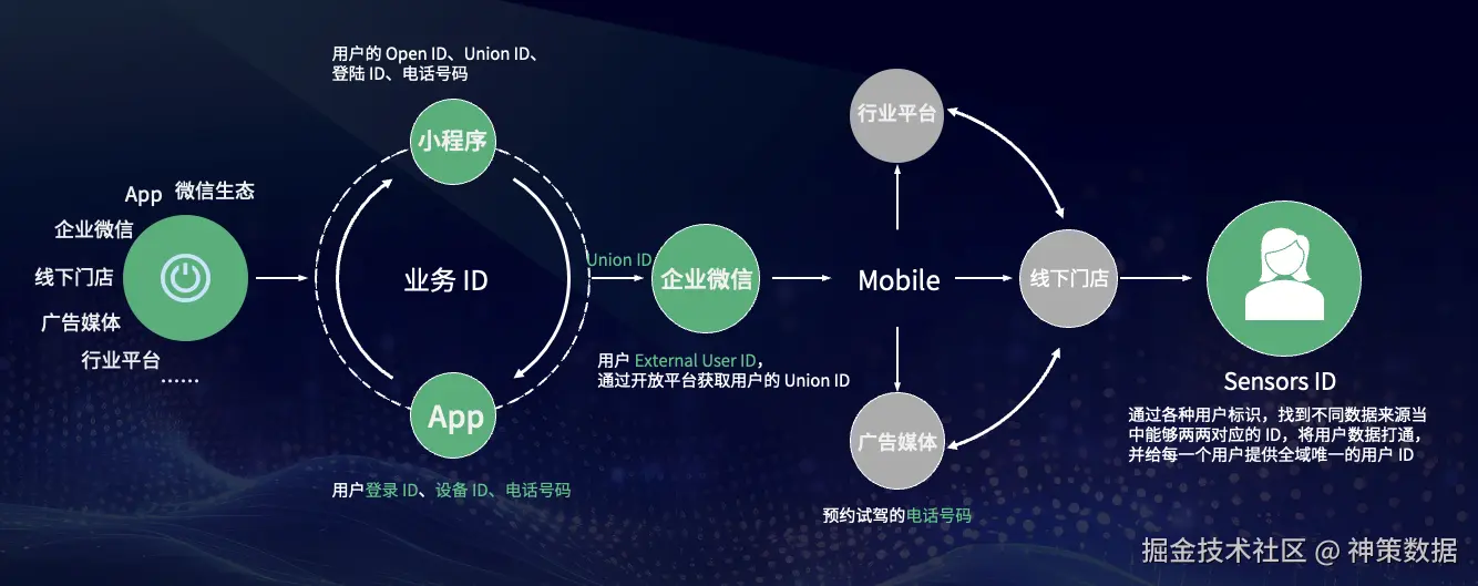 汽车消费者从兴趣、意向、试驾、购买、用车/服务体验,到置换/增购/转介绍的完整旅程中,涉及线上线下多个数字化触点,消费者相关数据也会覆盖各个渠道,包括微信小程序的 Open ID、Union ID、登录 ID 等,App 端的登录 ID、设备号码等,企业微信场景的 External User ID、通过平台获取的用户 Union ID 等,广告媒体端用户预约试驾的联系方式……