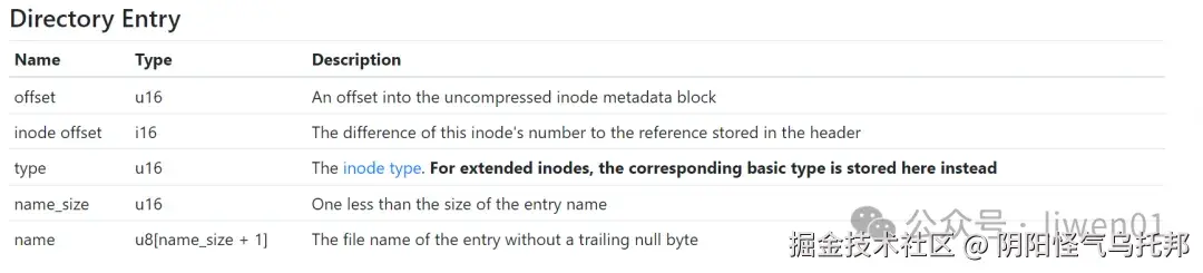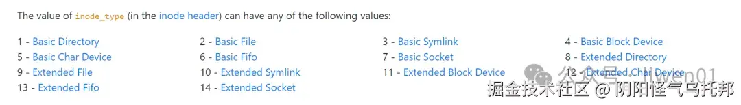 inode_type 是inode的类型,数值2表示普通文件,其它类型定义如下: