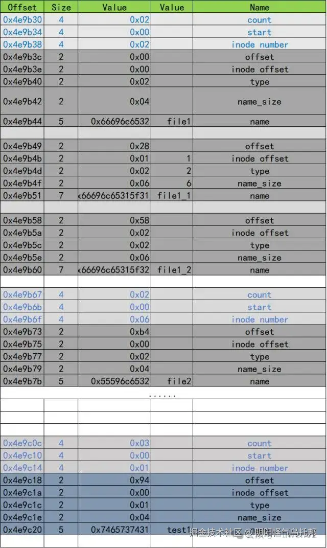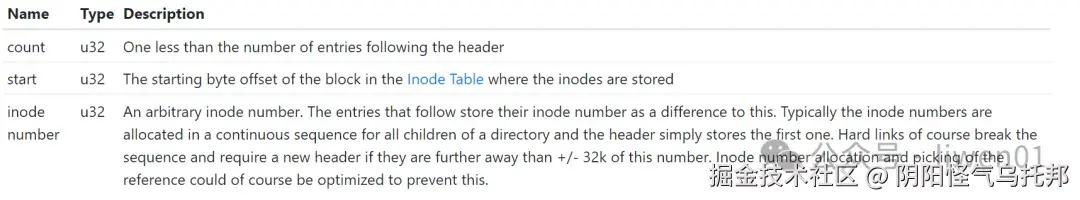 这里最开始是一个directory header结构,它由count、start、inode number组成,它们定义如下: