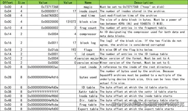 Squashfs的一个镜像文件它最多包含下面9个部分:Superblock、Compression options、Data blocks fragments、Inode table、Directory table、Fragment table、Export table、 UID/GID lookup table、Xattr table。
