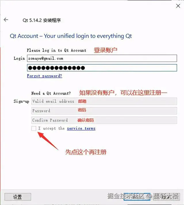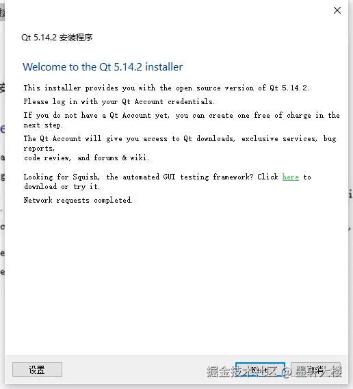 如果有Qt账号,直接登录就可以了,如果没有可以在下面注册一个,然后点Next(如果不想填写,请先断网,然后重新打开安装程序)