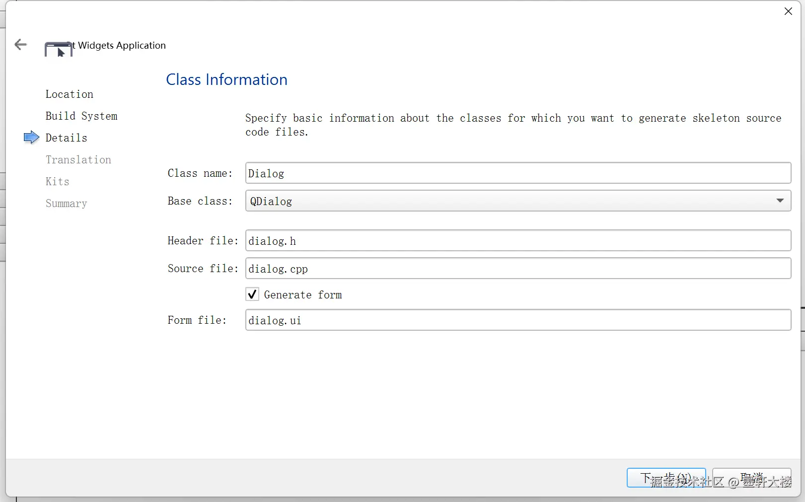 设置项目名称和路径,按照向导进行下一步,在 BaseClass 处选择 QDialog。