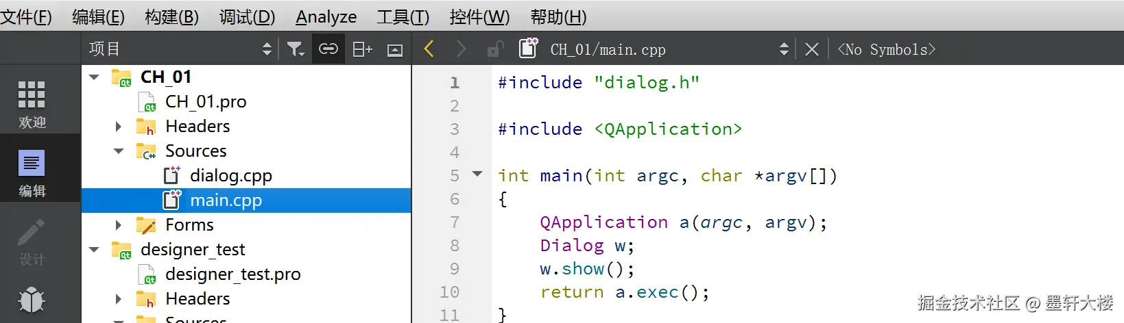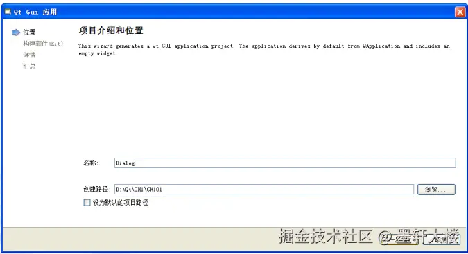 项目命名没有大小写要求,依据个人习惯命名即可。这里将项目命名为Dialog, 保存路径为D:\Qt\CH1\CH101,单击“下一步”按钮进入下一步骤。