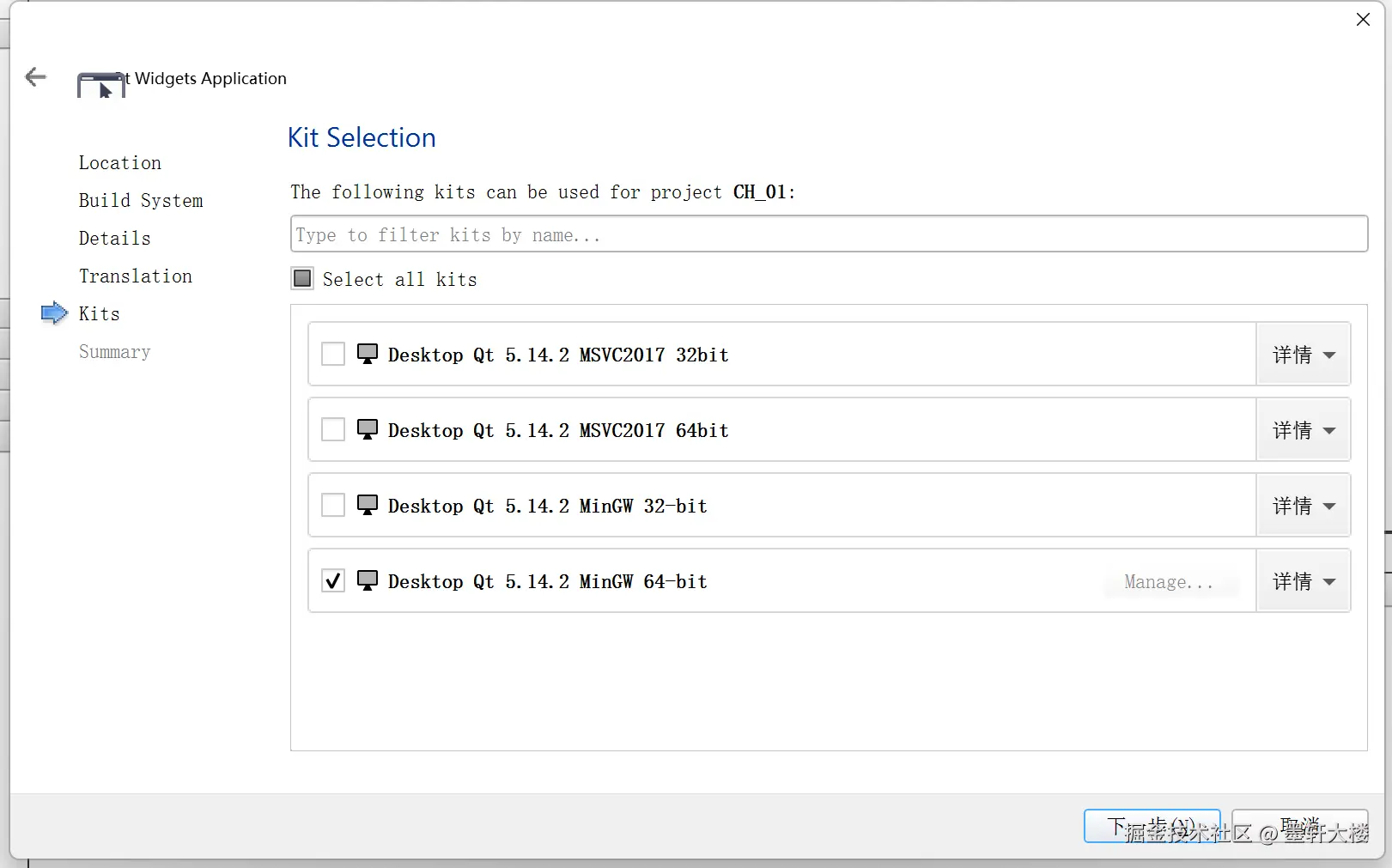 选择构建套件,此处我们选择 MinGW 64-bit ,构建一个在 64 位操作系统中运行的软件。
