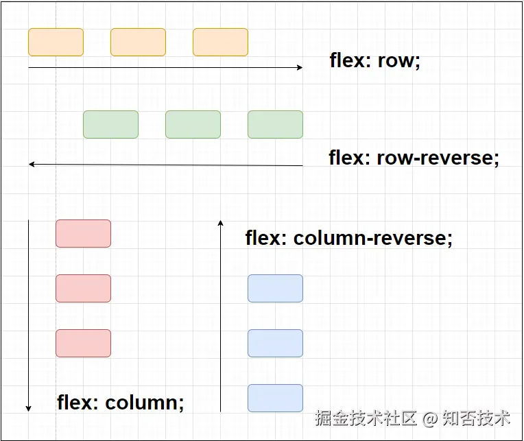 我们把元素的排列方向叫做主轴,与之对应的叫做侧轴。如果属性值是 row ,那主轴就是 X 轴,侧轴就是 Y 轴。如果属性值是 column ,那主轴就是 Y 轴,侧轴就是 X 轴。