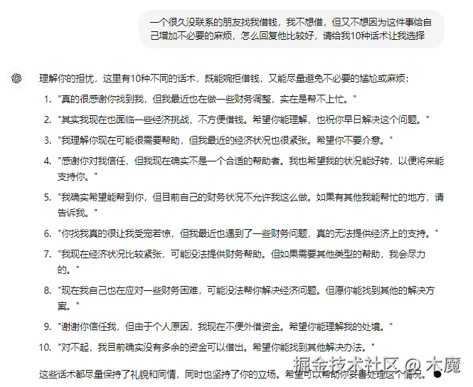 玩法3:回复社交聊天或者评论 假设你一个很久没联系的朋友找你借钱,这让你很为难咋办,把问题描述给chatgpt ,让它想一个周全的回复