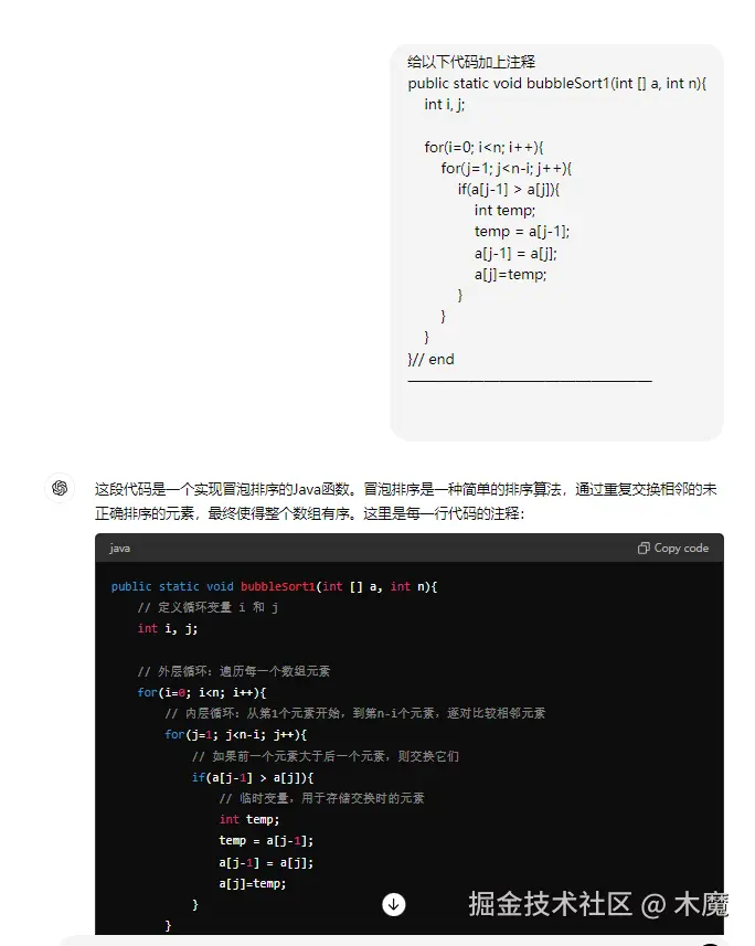 玩法2:让chatgpt 帮你写代码注释 据说很多程序员都喜欢给自己的代码加注释,现在可以直接把需要注释的代码丢给chatgpt 让它帮你完成这项苦恼的工作。