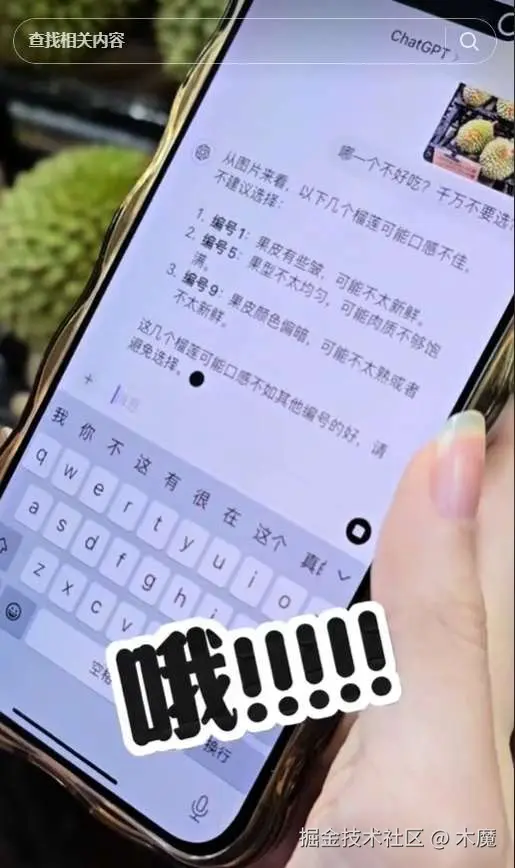玩法1:用chatgpt 帮你挑选榴莲,选西瓜 带壳的瓜果不保熟怎么办,拍个照片丢给chatgpt,让它帮你排雷