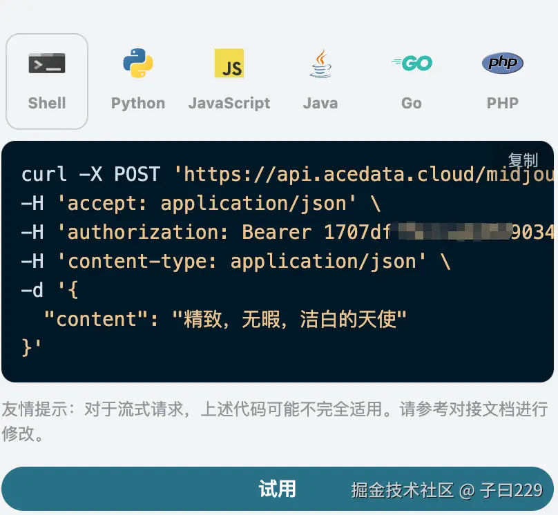 accept:指定接收 JSON 格式的响应结果,这里填写为application/json。authorization:调用 API 的密钥,申请之后可以直接下拉选择。