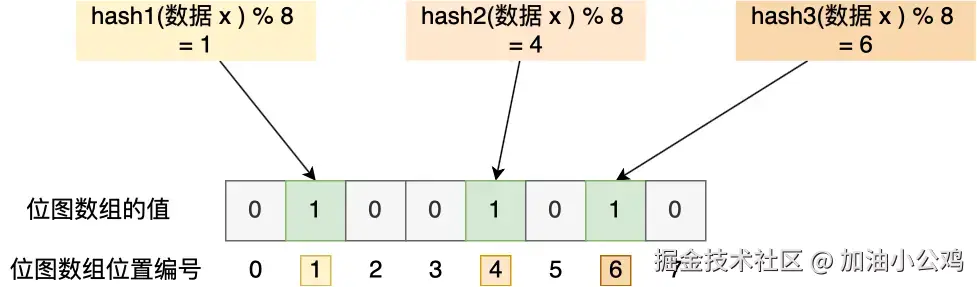 举个例子,假设有一个位图数组长度为 8,哈希函数 3 个的布隆过滤器。