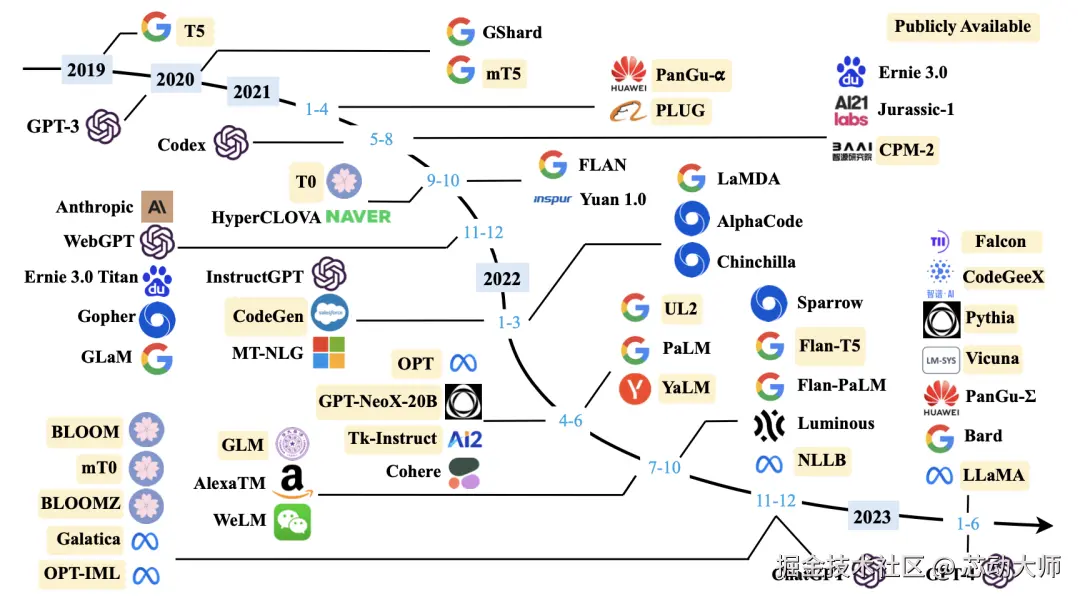 除了OpenAI外,国内外还有非常多的公司参与大模型赛道(国内的报道可以参考晚点发布的「大模型创业潮:狂飙 180 天」,见参考文献15,不过大模型发展太快了,一天一个样,可能等读者看到时,又有新的创业公司加入大模型挑战赛了,或者有更先进、更厉害的模型出现了),下面图2是截止到2023年6月底国内外重要的大模型的发展脉络。