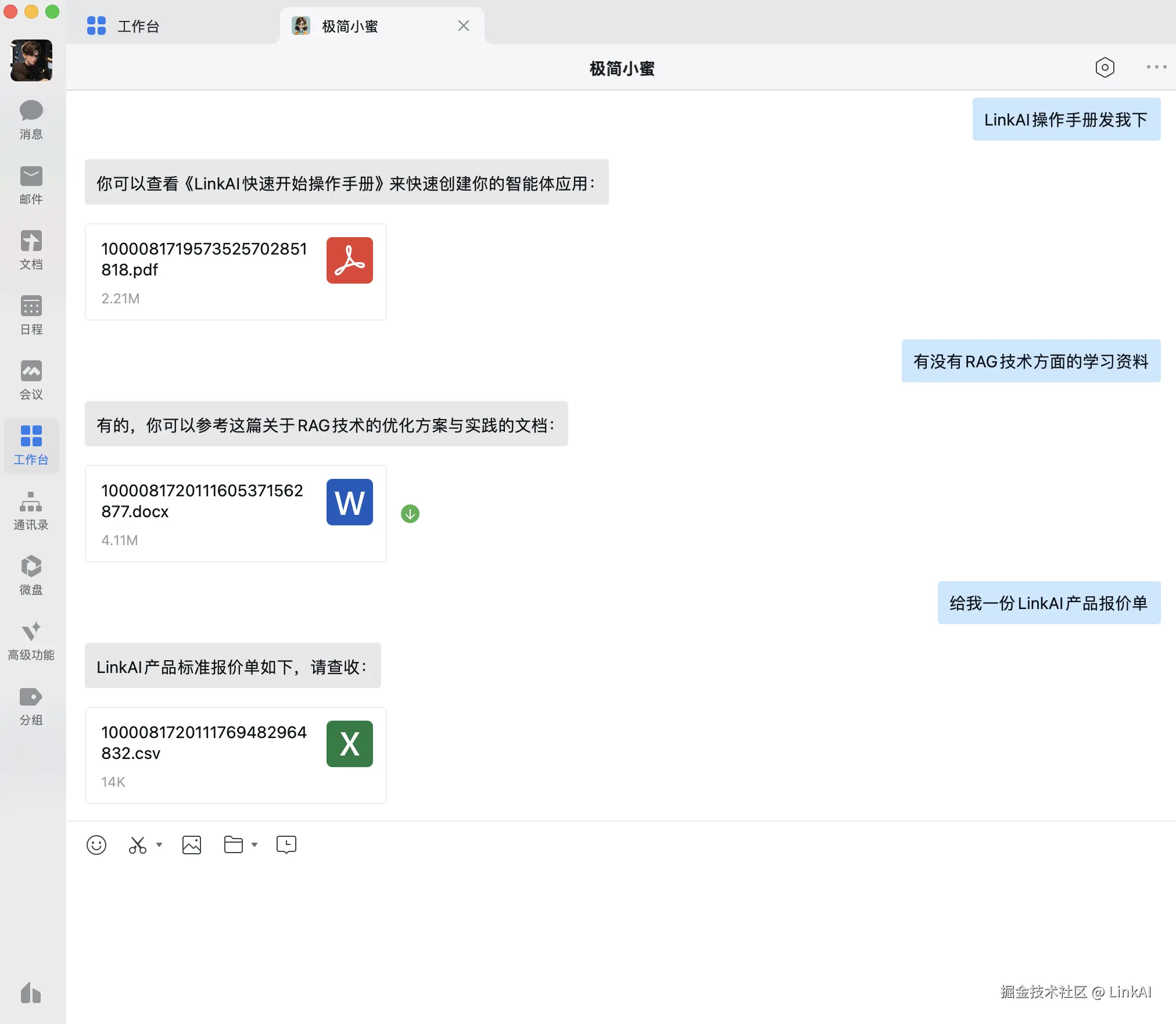 知识库素材发送能力,不仅在网页端使用时支持,LinkAI的应用接入渠道(网站嵌入、钉钉、飞书、企业微信等)均可兼容。