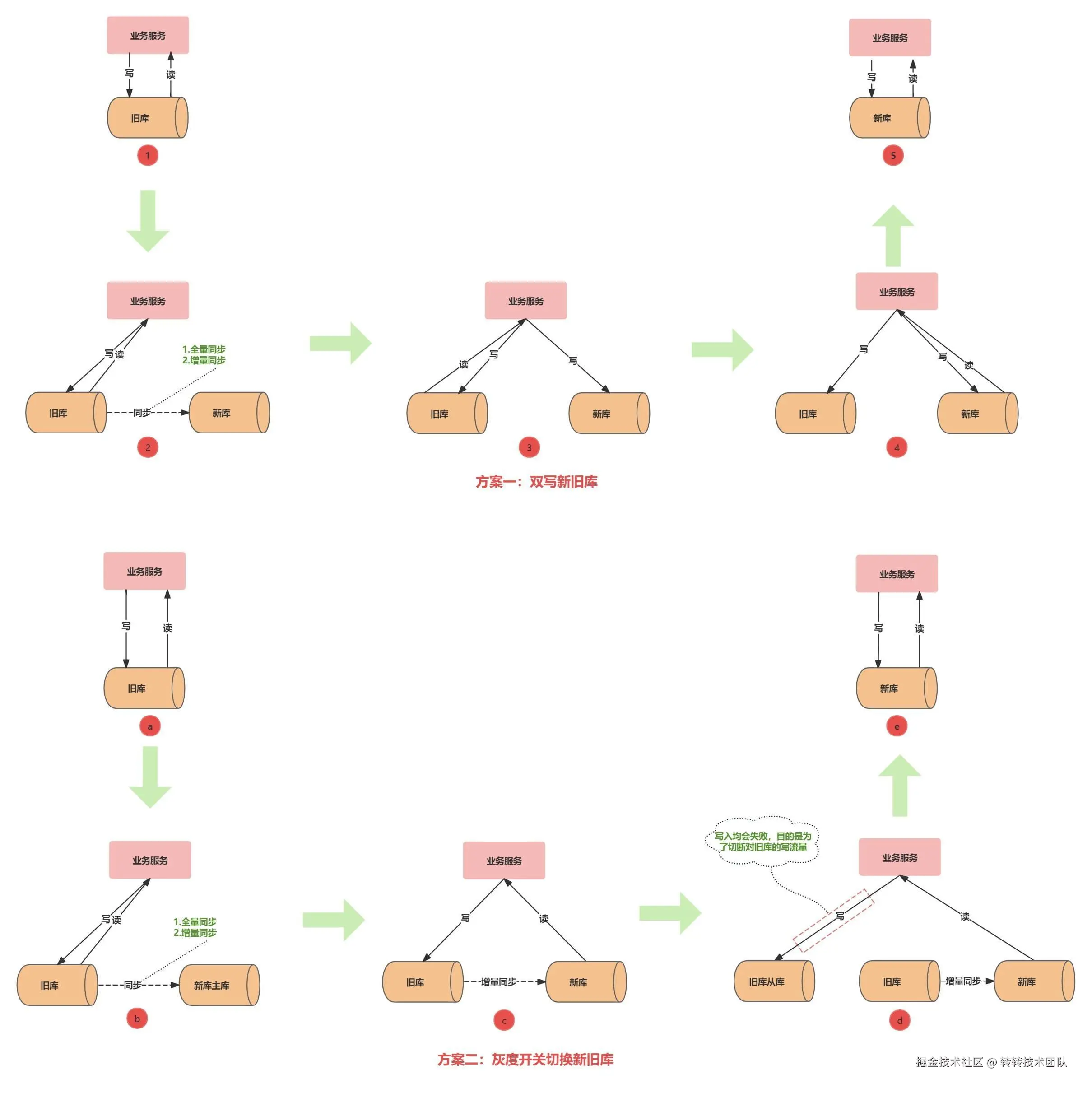 - ④新旧库切换:整个切换流程的核心,改造好的业务服务上线。先切断对旧库的写入流量,让新库与旧库的增量同步追平,同时校验新库与旧库表数据的一致性,一致时便可把写流量切换到新库。