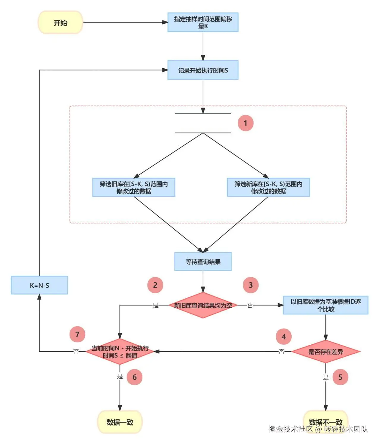 根据目前业务现状,已经到终态的冷数据基本不会有写入操作。为尽可能缩短写入失败时间,业务数据校验的重点放在近期修改过的数据。冷数据不需要每次一致性校验时都参与进来。可以根据更新时间作为筛选条件,在新旧库抽取最近一段时间内修改过的数据,逐行对比数据是否一致,校验流程如下图所示: