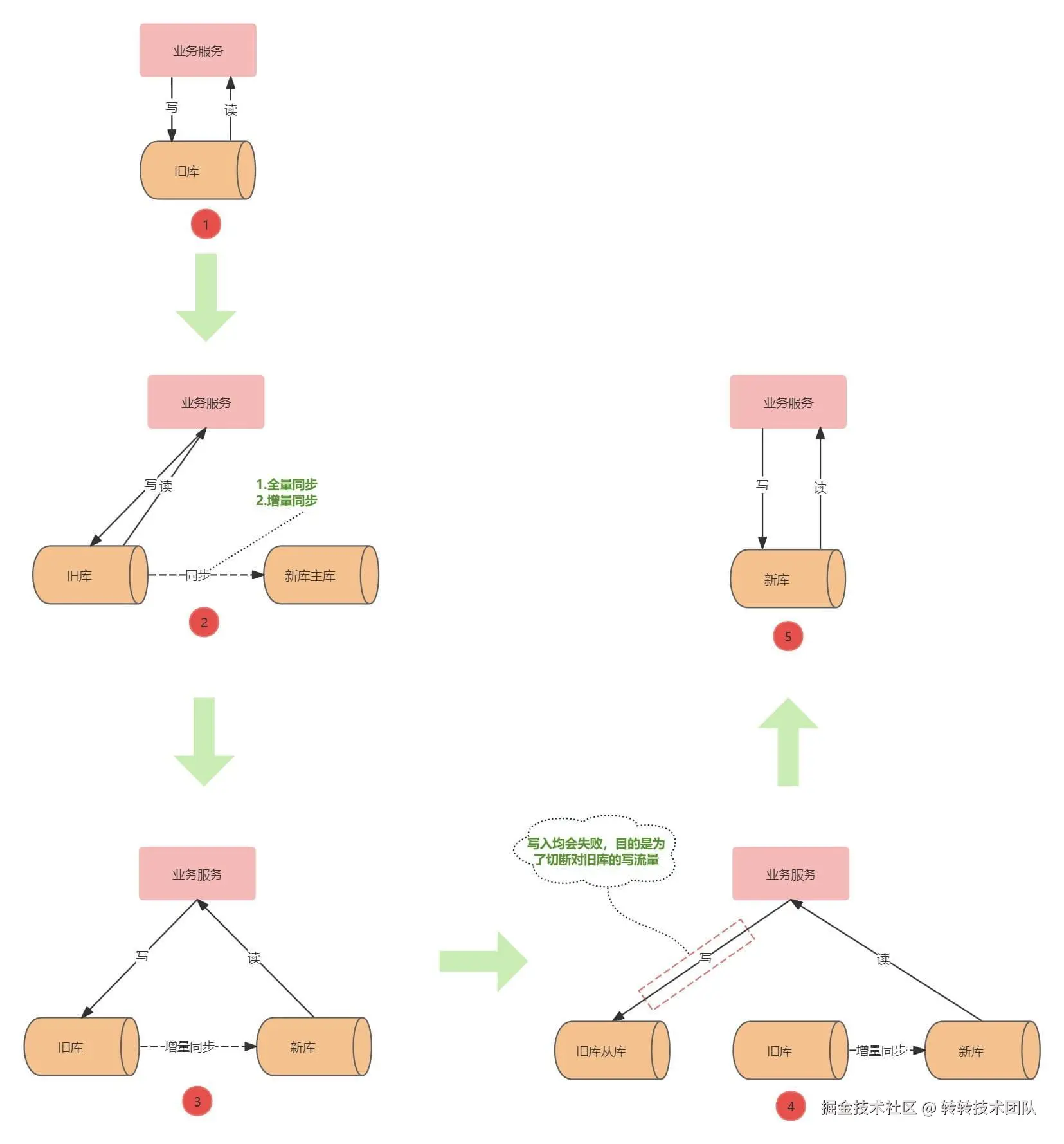- ⑤代码清理:读写流量全量切换新库,下线写旧库代码。