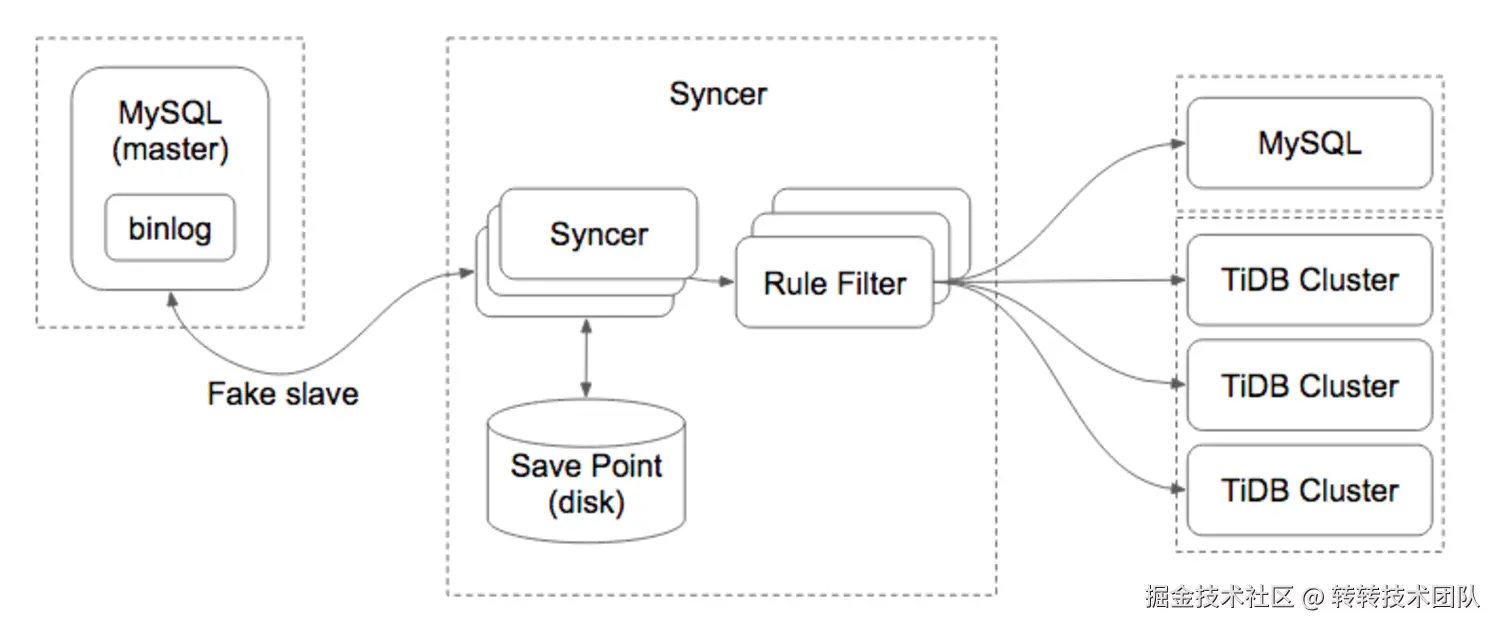 从Syncer架构图不难看出:同步时Syncer把自己伪装成一个 MySQL Slave,和 MySQL Master 进行通信,然后不断读取 MySQL binlog,进行 binlog 事件解析,规则过滤和数据同步。