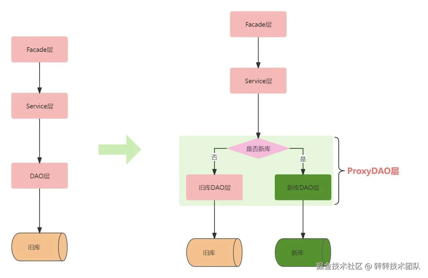 需要迁移的表数量不多,实现时对DAO层代码进行改造,抽取ProxyDAO层,原来对DAO层的方法调用全部替换成ProxyDAO,ProxyDAO层代码植入开关控制代码,根据开关决定访问新库旧库。