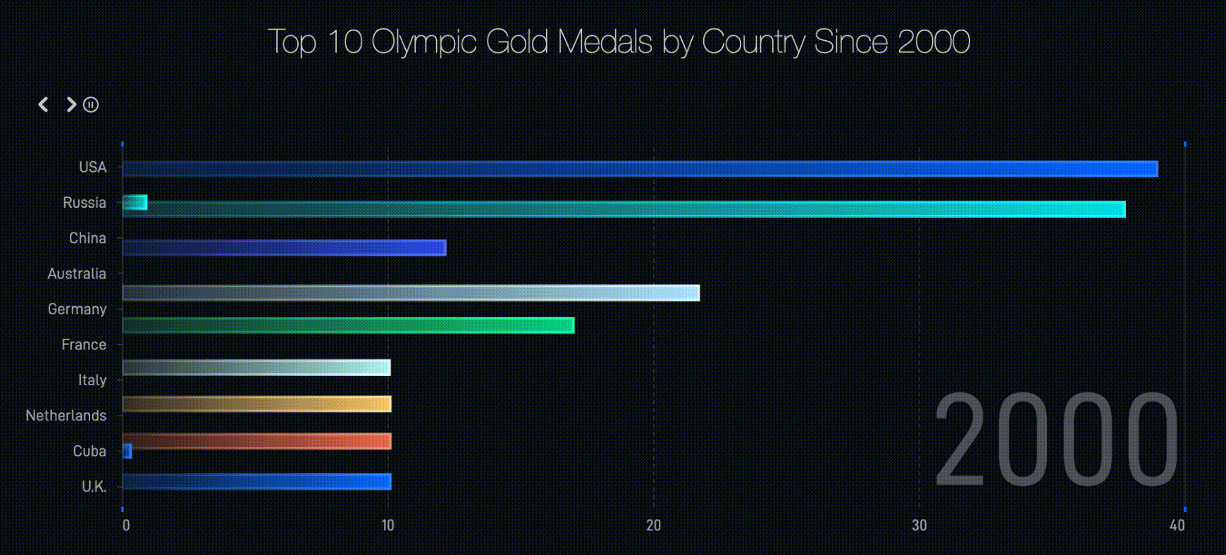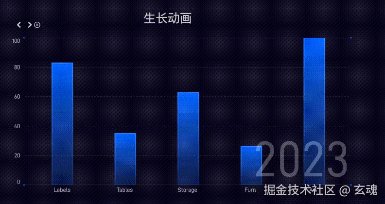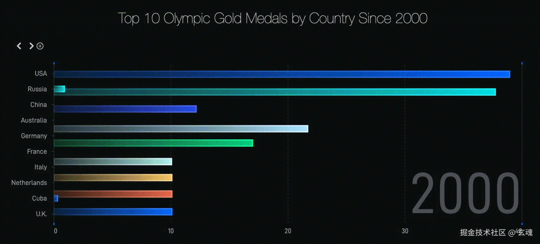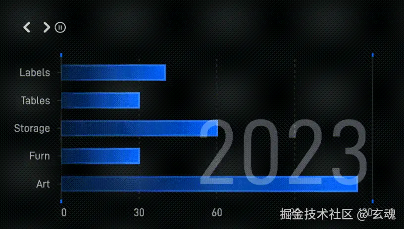 时序动画通常伴随着时间数据的递增或递减顺次进行,VChart提供的Player组件可以对这种场景进行动画的自动、手动播放/切换的控制。