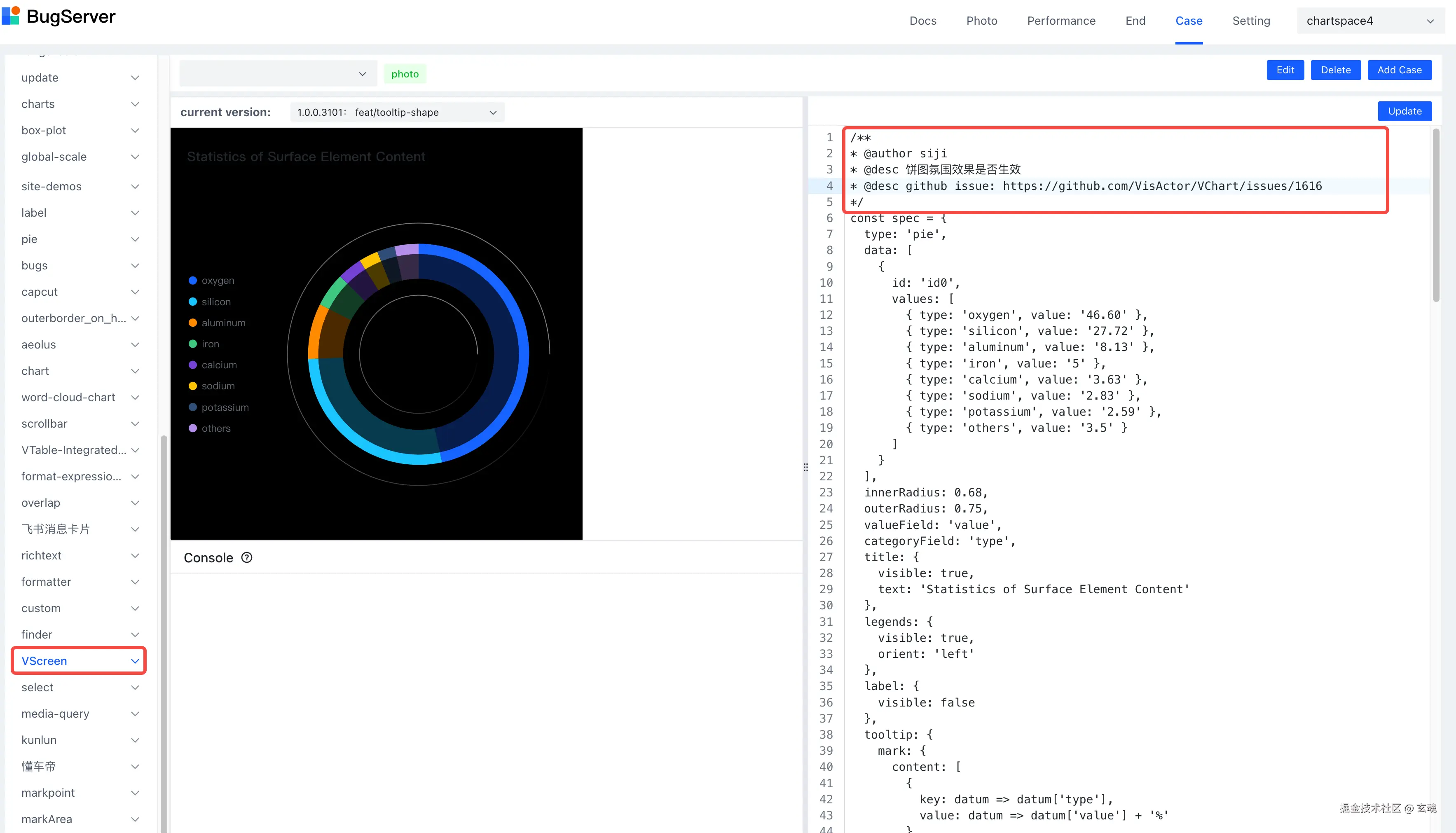 由VChart底层引起的问题,可以通过在图表库的质量保证平台BugServer添加case,如果有问题,在图表库发版前能被及时发现