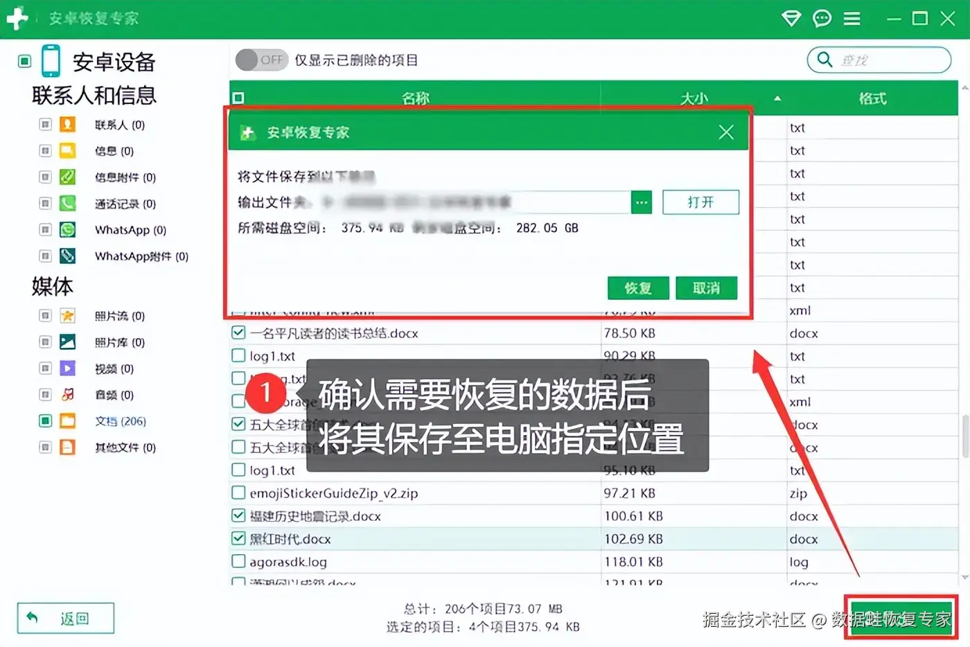 如果你没有开启云同步,或者数据丢失是由于其他原因造成的,那么专业的数据恢复软件将是另一个选择。市面上有许多针对手机设计的数据恢复工具,例如【数据 蛙安卓恢复专家】,能够尽可能找回你丢失的文档。其特点如下: