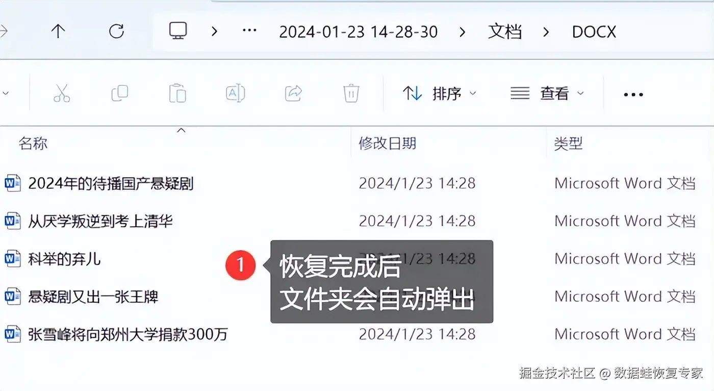 步骤3:当恢复步骤完成后,word文档还原到指定文件夹。此时,该文件夹会自动弹出,我们就可以检测文档的完整性了!