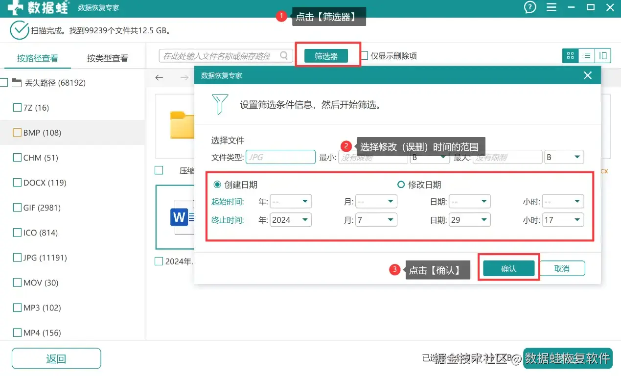 步骤4: 扫描结果出来后,如果需要快速找到误删文件,可以选择使用【筛选器】功能,通过输入误删时间的范围能够快速排查目标文件。