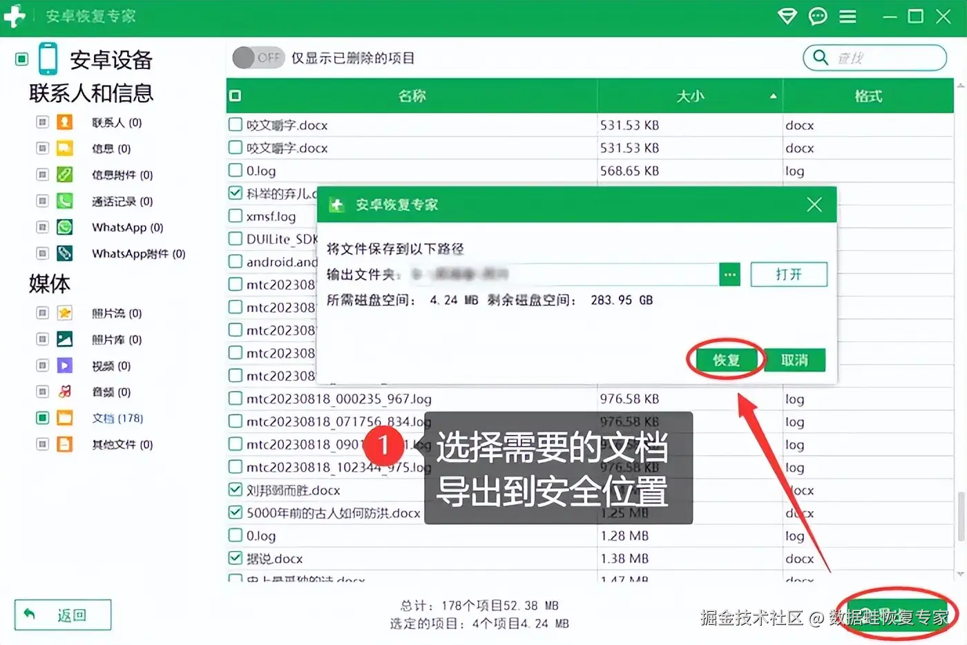 如果第一种方法无法找回丢失的word文档,我们可以考虑使用恢复软件。市面上有很多针对安卓手机的文件恢复软件,例如【数据 蛙安卓恢复专家】,它采用先进的扫描和恢复技术,能够深入手机存储设备,快速找到已删除的文件,并尽可能恢复。软件界面简洁明了,操作步骤清晰易懂,简单几个步骤就能完成,例如: