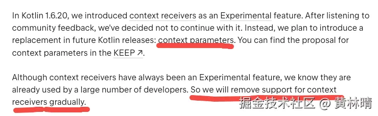 其中对开发者而言较为重要的就是Kotin将逐步删除Context receivers特性。