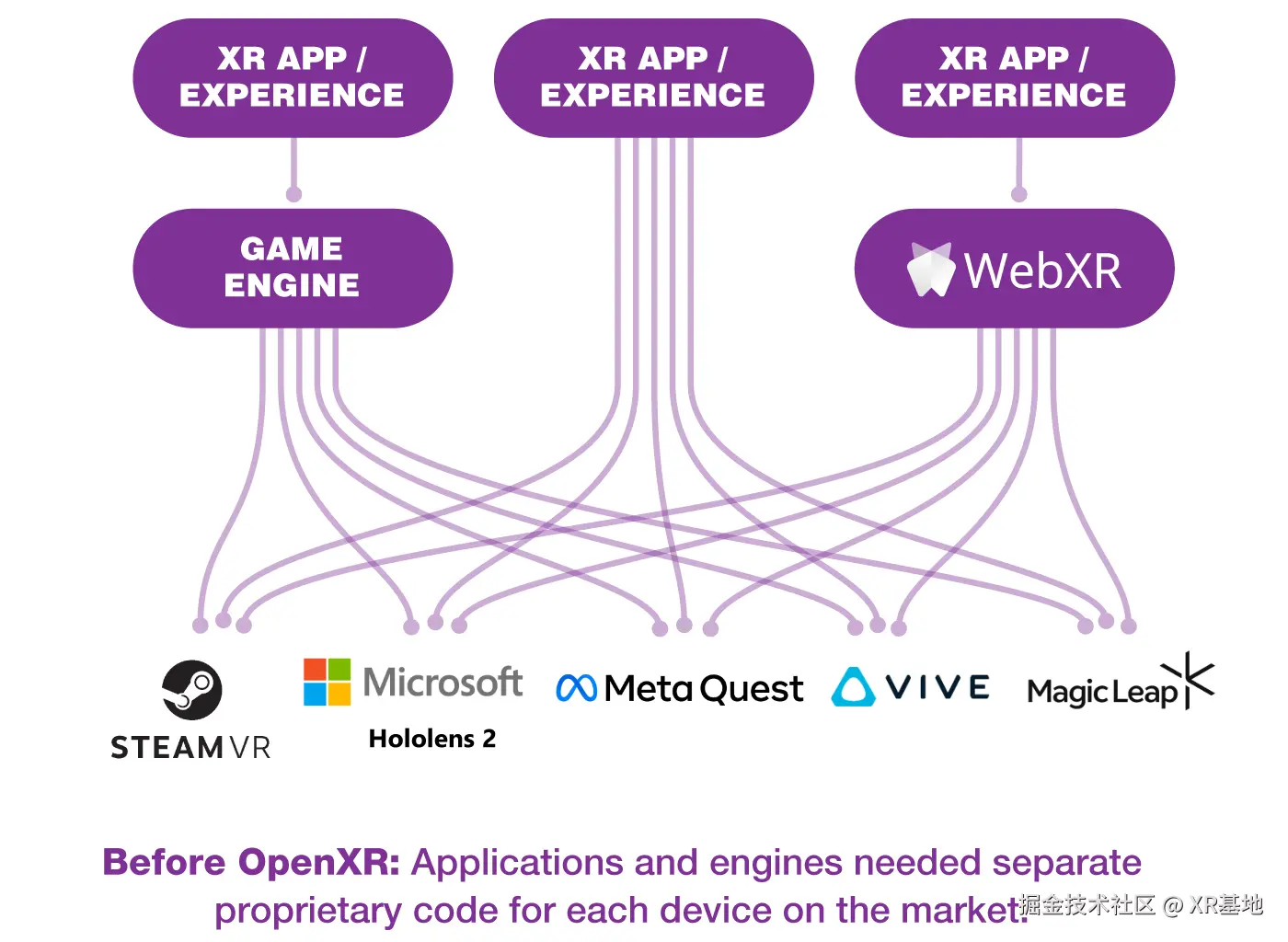 可以想象一下,如果你是一个小小的 “VR 计算器” 应用的开发者,刚刚花了一个月的时间打磨好了自己的 App,当你刚刚在 Quest 上上架了你的 App,接下来,当你想把自己的 App 上架到 Hololens、HTC Vive、MagicLeap 上的时候,发现这些平台提供的 API 都完全不同,相当于是你之前所做的所有工作都几乎要完全重来,如果想要完全上架这些所有的 App,你就需要额外再花四五个月的时间去学习和开发这些平台上的 App,这得是有多崩溃?