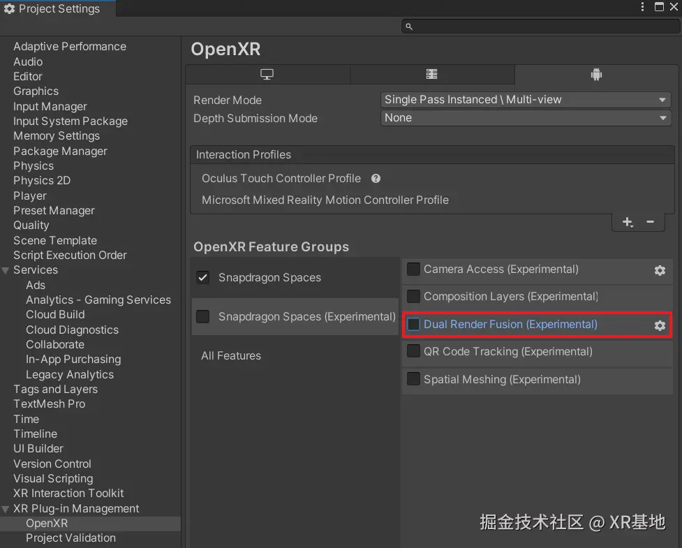 例如,如果我们想实现 Dual Render Fusion(双渲染融合)功能,我们只需要在 Unity 的 OpenXR 设置中,在 Snapdragon Spaces(Experimental) 这个 OpenXR Feature Groups 中勾选上 Dual Render Fusion(Experimental) 这个选项,就完成了绝大多数的项目设置的内容(更加详尽的设置内容,请参照 官方文档):