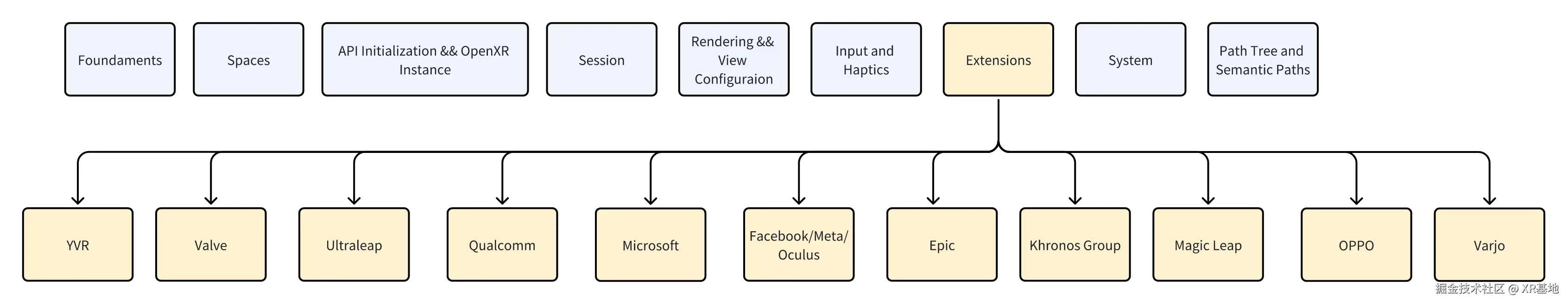 其他的 API 分类我们暂时不深入展开,比较有意思的是 Extension 这部分,在 OpenXR 的定义中,Extension 被定义为硬件厂商可以选择性实现的 API,而 OpenXR 工作组的成员,都可以在已注册扩展中增加新的内容,我们可以看到这其中有不少业界的 XR 公司。