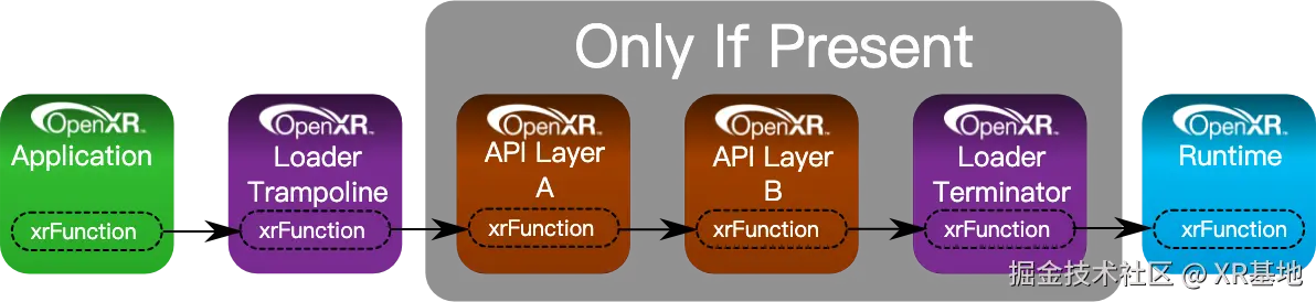 而在 OpenXR 实际的工作流程中,一个使用了 OpenXR 的应用程序(例如 Unity、Unreal,或者是支持了 WebXR 的浏览器)在调用这些 OpenXR 的函数时,会通过当前系统中的 OpenXR Loader(其作用是在当前的系统环境中,找到正确的 OpenXR 实现),再通过 OpenXR 所定义的 Layer(可选,类似于各种编程语言的钩子函数或者后端程序中的中间件,可以在底层拦截或者修改一个函数的调用过程),最终调用到硬件所提供的符合 OpenXR 的具体实现,而这个具体实现,我们一般就称之为 OpenXR Runtime。