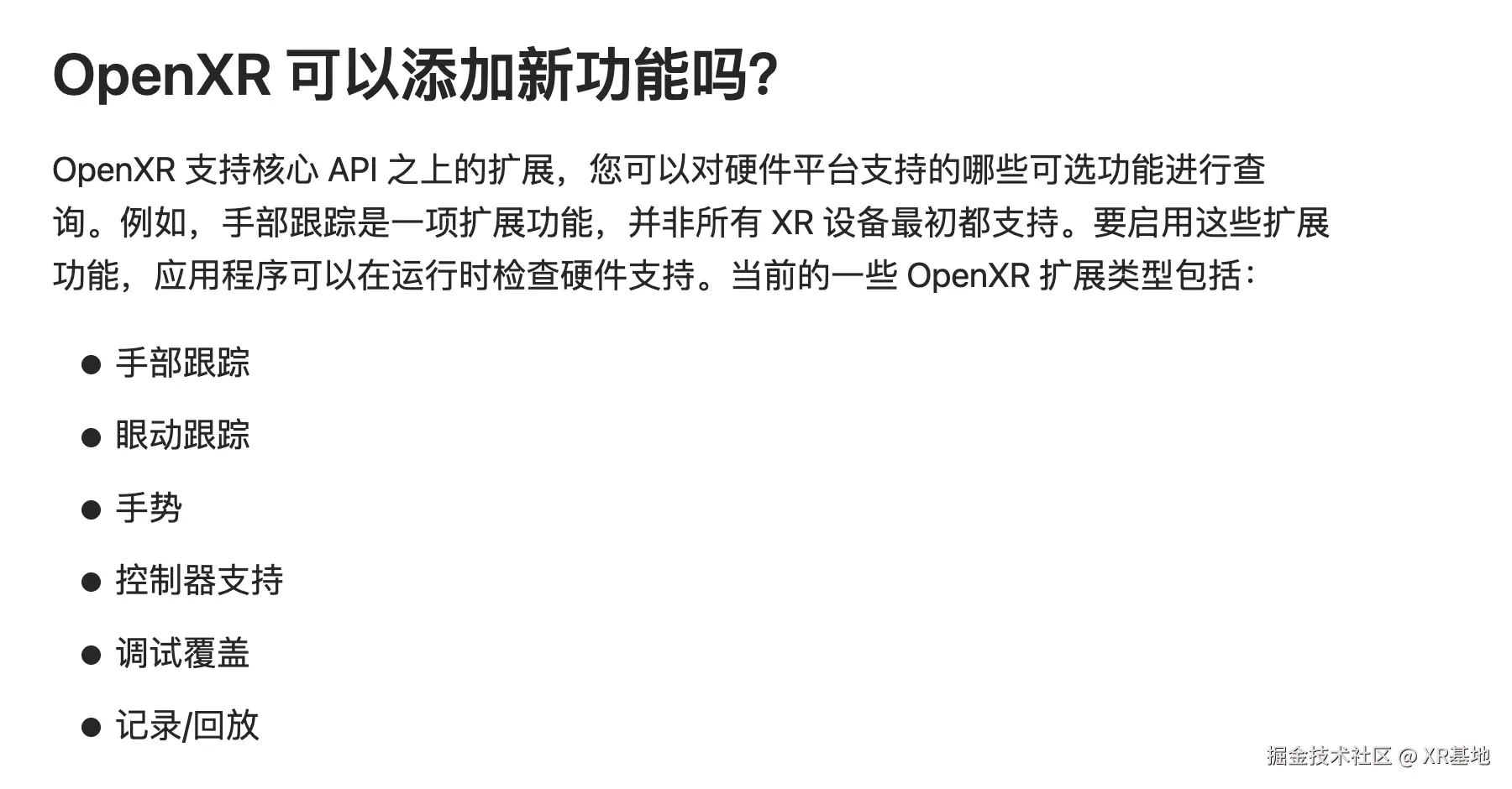 你可能注意到了,这里很多的功能并不是所有的 XR 设备都拥有的,因此上面一些非标准的功能,例如手部追踪,就是基于我们前面看到的 OpenXR Extension 实现的:
