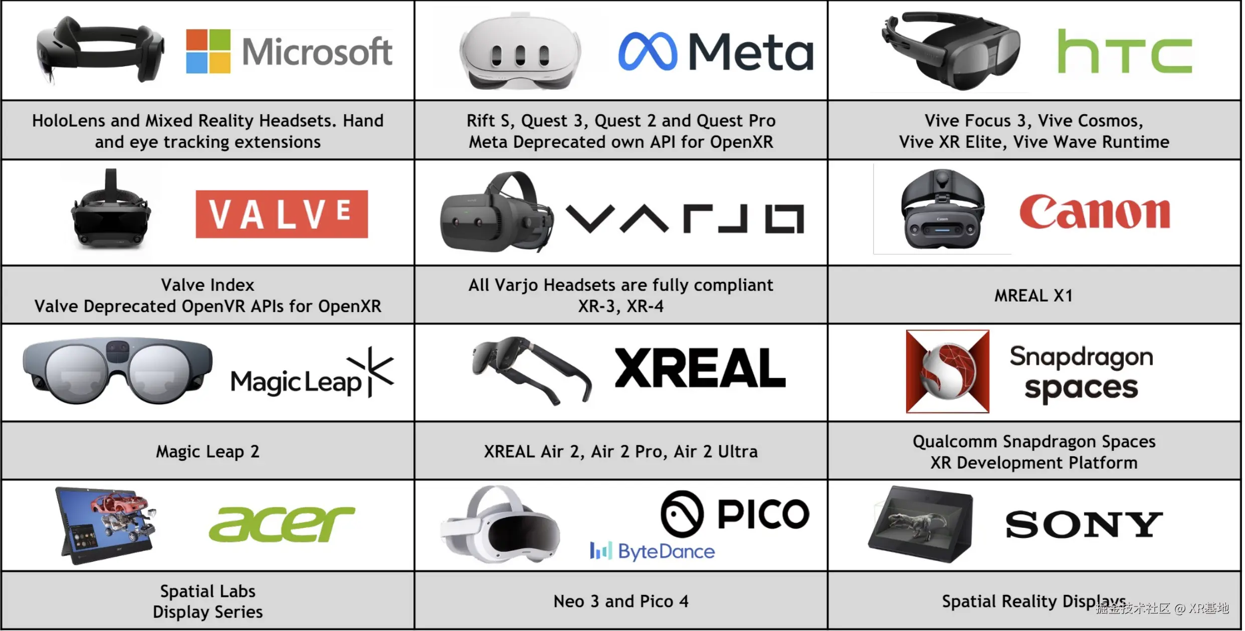 而这些针对 OpenXR 进行适配的上层应用,也都可以相对比较低成本的用适配了 OpenXR 的版本来支持以下的这些设备:
