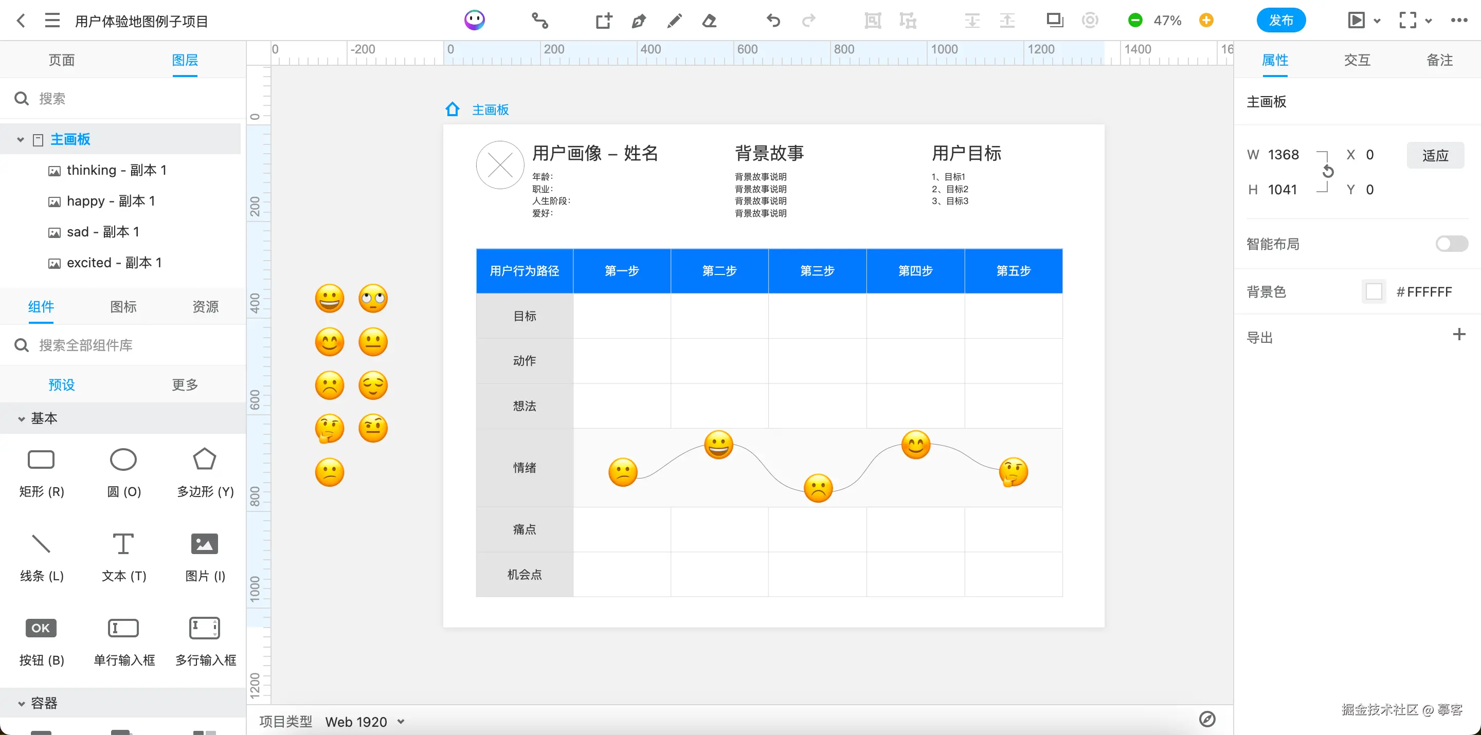 **1、**Mockplus RP(www.mockplus.cn/rp)是一款优秀的在线设计工具,可以轻松完成用户体验地图的绘制。它集成了丰富的组件、图标等素材,不需要下载安装软件,支持多个产品经理或设计师同时编辑,设计效率大幅提升!