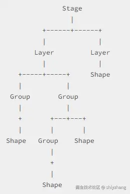 Konva 的对象是以一颗树的形式保存的,Konva.Stage 是树的根节点,Stage 子节点是用户创建的图层 Konva.Layer。