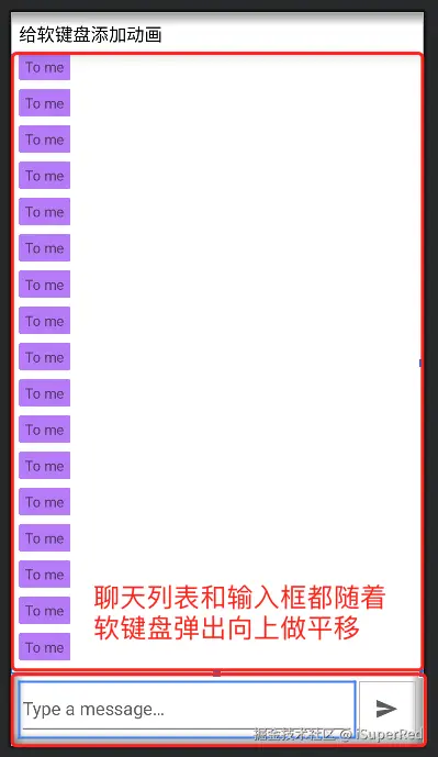 官方 demo 还提供了聊天内容 Recyclerview 上下滑动和软键盘弹出、关闭联动的实现,在 InsetsAnimationLinearLayout 这个类里。