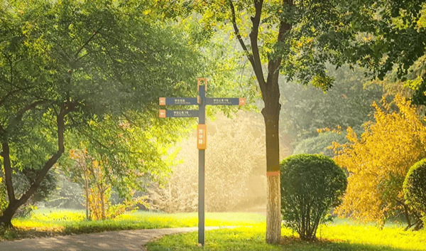 "A cross-shaped road sign stands in the middle of an outdoor park, surrounded by trees and grasslands. The background is sunny with warm colors. There is sunlight shining through the leaves onto part of it. On one side of that street post there was also another sign with the lettering \"Kunming Park\", which looked very beautiful. This photo shows how wonderful nature can be. It gives people feelings like relaxation or tranquility in the style of nature. --ar 75:44",