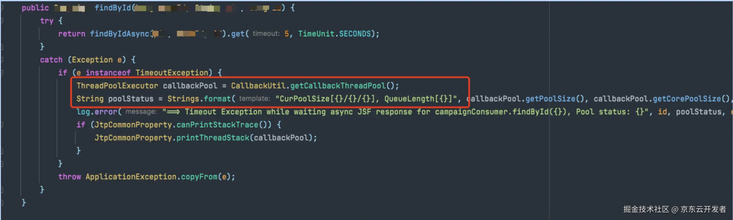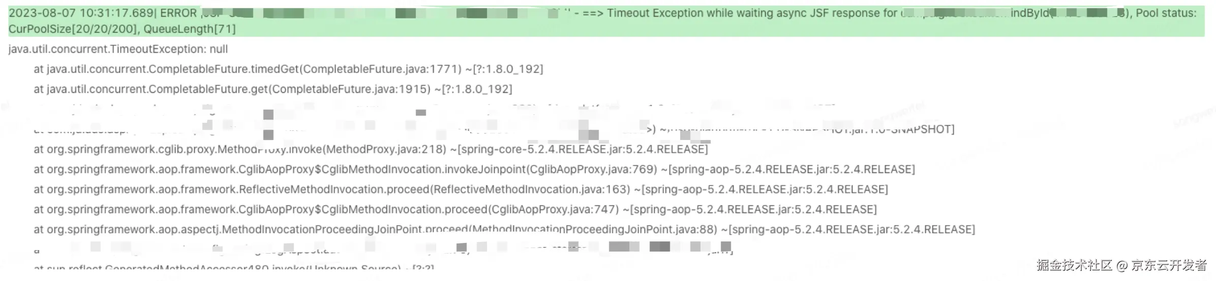 通过监控我们可以发现,这个接口偶尔会出现可用率降低,一般接口可用率降低可能是因为超时或者触发了某些隐藏问题导致,但是这个接口的逻辑非常简单,就是根据id查询数据库,业务逻辑非常简单,理论上不应该出现这么多可用率降低的情况。我们通过日志排查发现在异步调用使用CompletableFuture的get方法阻塞等待的时候发生了TimeOutException异常,目前接口配置的超时时间为5s,本来接口超时是一个我们经常遇见的问题,但是我们去提供者端查询日志发现,本次请求只耗费了几毫秒,明明提供者端几毫秒或者几十毫秒就返回了,为什么消费端还超时了,带着这个疑问我们继续分析,会不会是JSF异步的原因导致的。