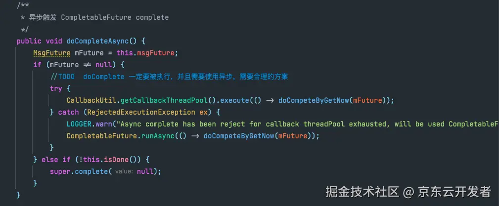 通过对已上源码的分析,我们虽然知道了JSF异步调用的全部流程,但是还是无法解释为什么偶尔会出现不应该超时的超时(此处指服务端明明没有超时,客户端还显示超时了),通过对各个流程的排除,我们最终定位到可能和JSF异步回调后将任务添加到Callback线程池去执行CompletableFuture的complete方法有关,因为这个方法会继续执行CompletableFuture后续的阶段,我们业务代码在拿到RpcContext里面返回的CompletableFuture对象以后,一般会使用CompletableFuture的一元依赖方法ThenApply去执行一些后续处理,CompletableFuture的complete方法就是用来触发这些后续阶段去执行的。