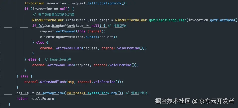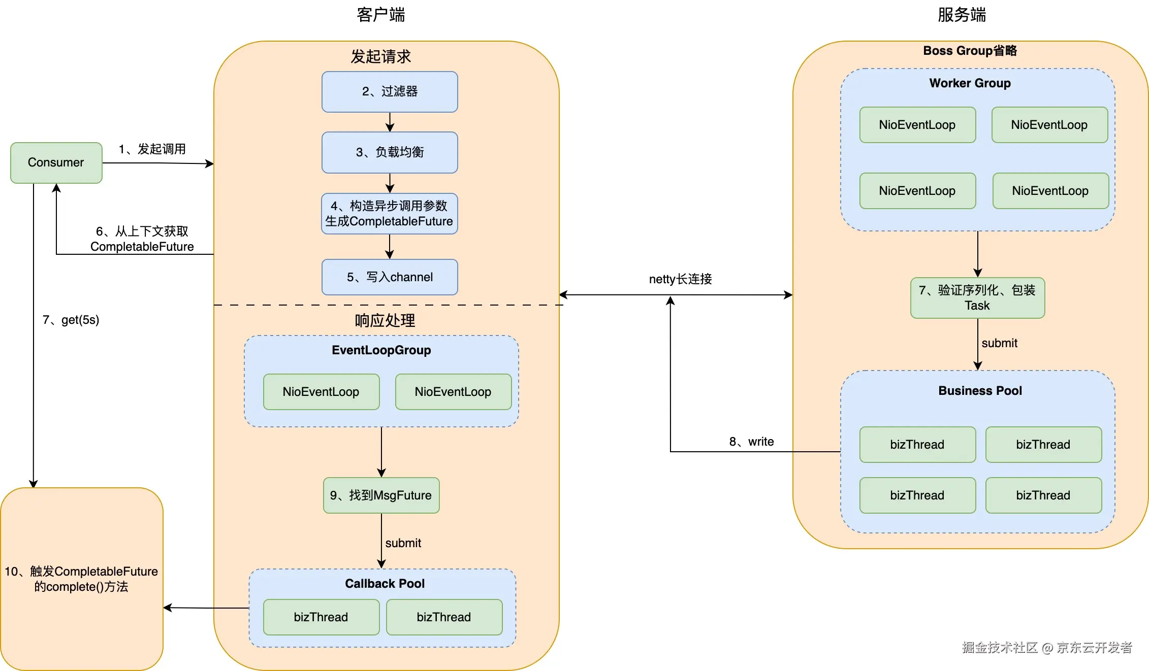 首先在doSendAsyn方法里生成MsgId和MsgFuture对象的映射,然后序列化数据,最后通过netty的长连接向channel里面写入要发送的数据。