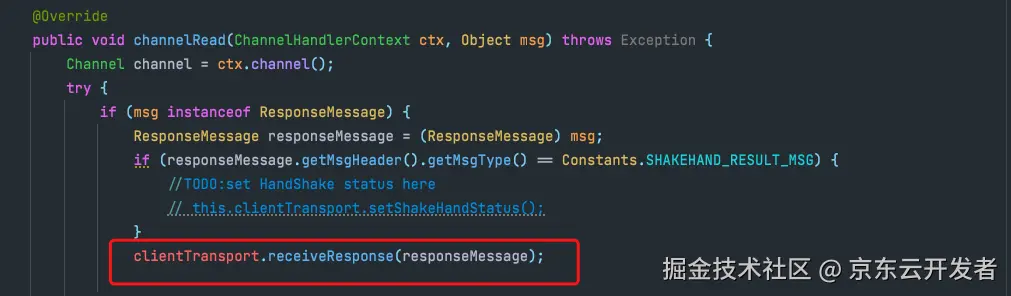 客户端收到响应后,会触发客户端的ClientChannelHandler类的channelRead方法,这个方法里面会通过服务端返回的msgId找到客户端缓存的MsgFuture对象,然后会判断对象内的compatibleFuture属性是不是非空,如果非空,会往Callback线程池内提交一个任务,这个任务的主要功能是执行CompletableFuture的completeExceptionally和complete方法,用于触发CompletableFuture的下一阶段执行。
