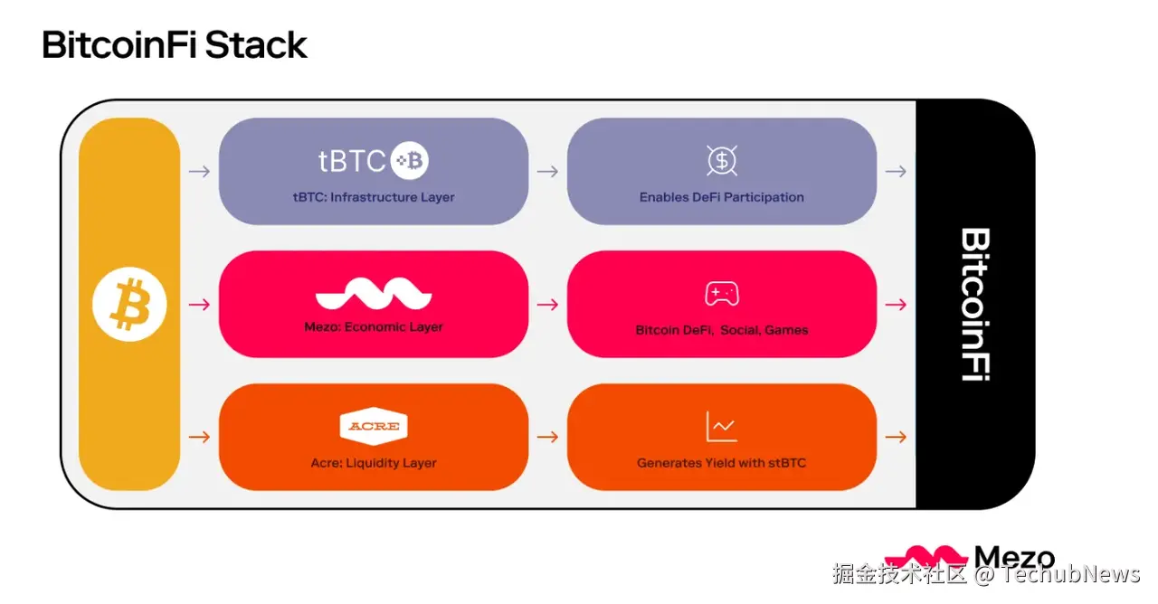 Mezo 由开发了 tBTC, Fold, Keep 和 Taho. 等产品的团队构建。这个团队多年来一直致力于比特币相关应用的开发。Mezo 的目标很简单:扩展 比特币的使用场景。它通过以下三种机制实现这一目标: