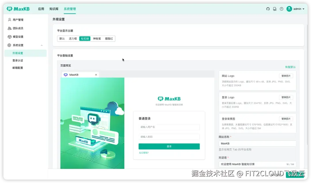 在v1.4.0专业版本中,MaxKB支持用户对知识库系统的网站Logo、登录Logo、主题色、登录背景图、网站名称、欢迎语等进行设置。借助这一功能,用户可以打造个人或者企业专属的知识库问答系统。