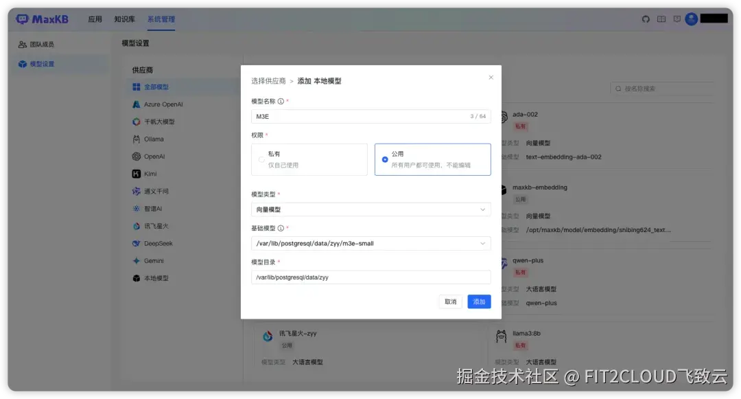 在v1.4.0社区版本中,MaxKB支持添加OpenAI、Ollama和本地部署的向量模型,并且支持将模型的使用权限设置为公用或者私有。在此前的MaxKB版本中,仅支持本地部署向量模型。在v1.4.0版本中,MaxKB通过API的方式支持用户引入外部向量模型,为用户提供多种选择。