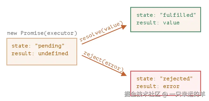 state—— 最初是"pending",然后在resolve被调用时变为"fulfilled",或者在reject被调用时变为"rejected"。result—— 最初是undefined,然后在resolve(value)被调用时变为value,或者在reject(error)被调用时变为error。