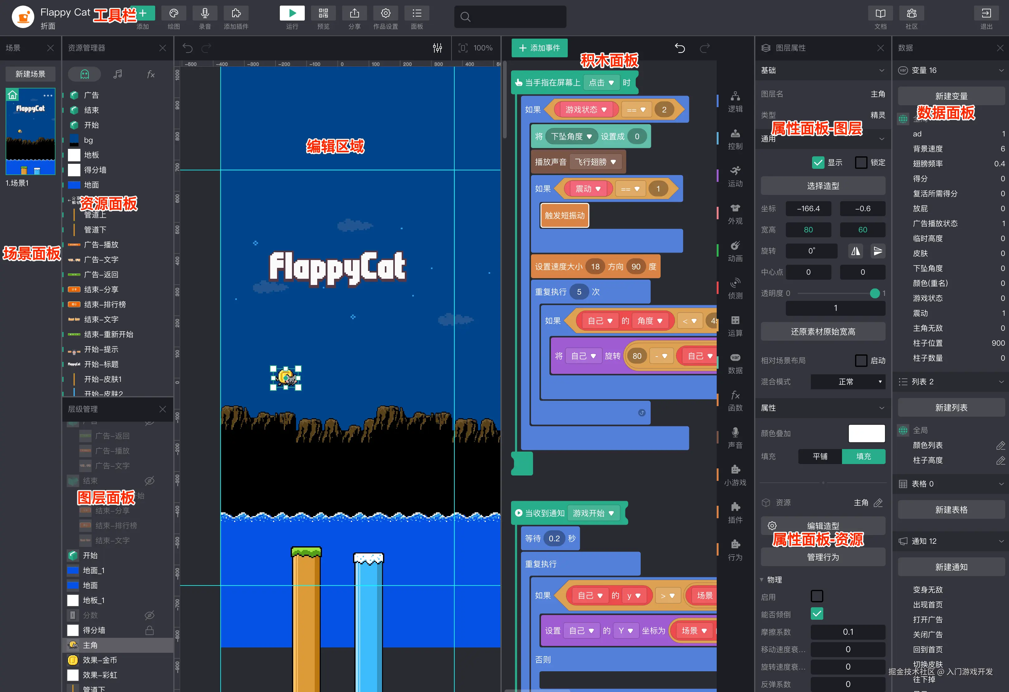 这个是微信小游戏团队亲自下场做的工具,特点是同样的低门槛可视化编程,另外一个特点是比较方便发布到微信上。而且功能上比较贴近游戏场景,有一些比较实用的游戏组件。但几年过去了,也一直不温不火。可能侧面说明了,低门槛的可视化工具要生产专业的商业化作品还是行不通。专业的事情,本身就需要非常专业的人和工具。但作为入门的工具也够了,比上面的三款工具更贴近游戏。