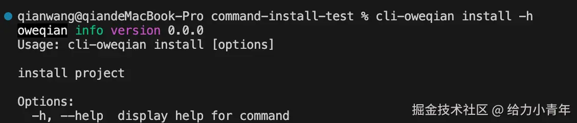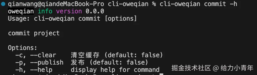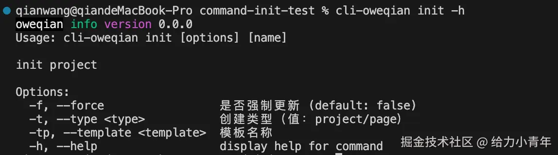这里的 --force 称为 option,用来辅助脚手架确认在特定场景下用户的选择。--force 可以理解为:--force true,简写为:--force 或 -f。